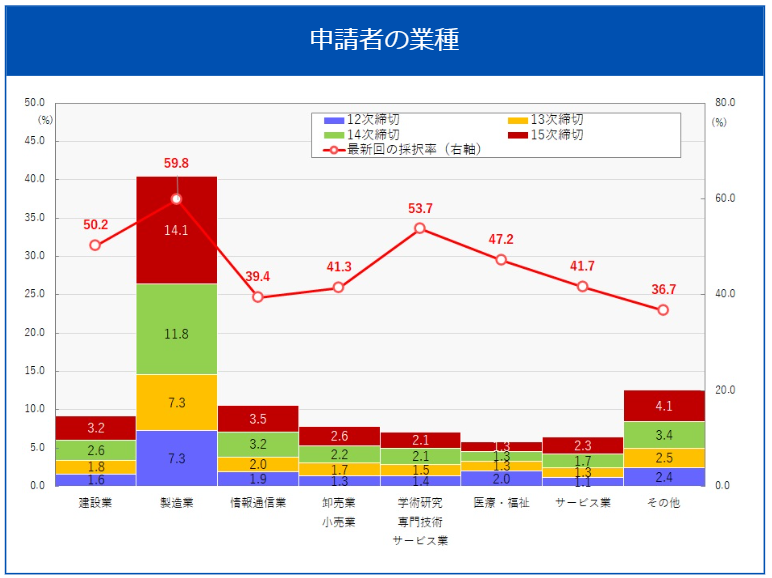 グラフを見てみると製造業の採択率が最も高くなっており、続いて学術研究・専門技術・サービス業が高くなっています。ただし、それ以外にも多くの業種が申請していることがわかるでしょう。