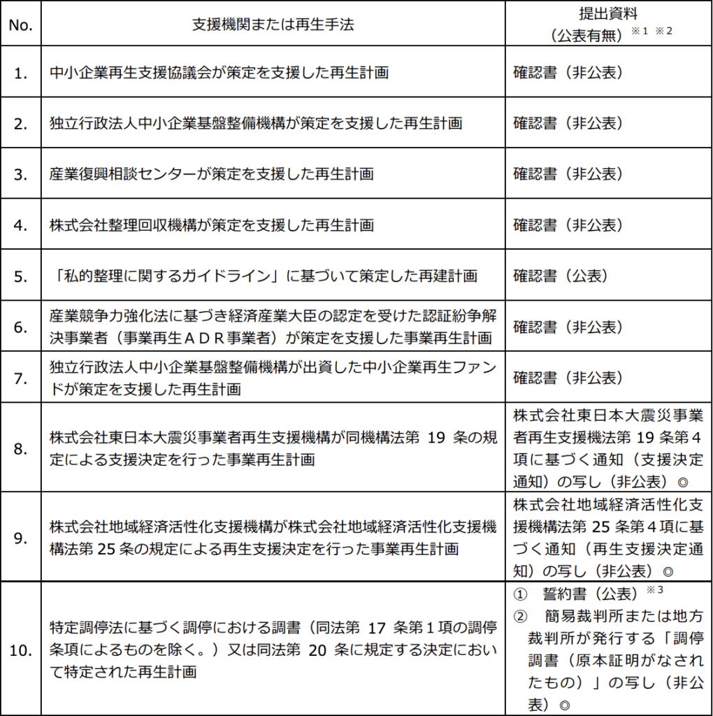 支援機関には、中小企業再生支援協議会、中小企業基盤整備機構、産業復興相談センター、整理回収機構などがあり、これらの機関が策定支援した再生計画や、私的整理ガイドラインに基づく再建計画、事業再生ADR制度による事業再生計画などが対象となります。