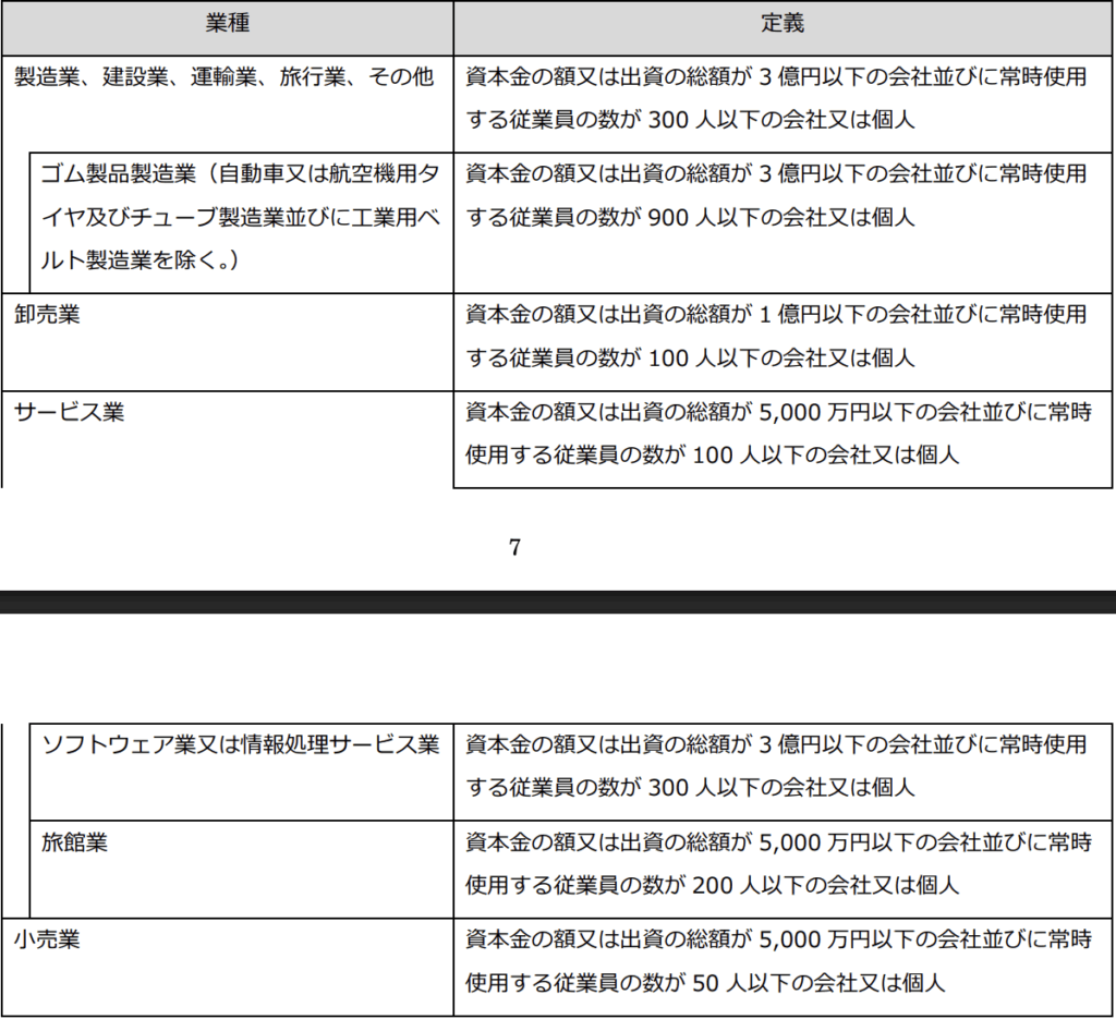 中小企業に当てはまるのは、業種ごとに一定の資本金額、従業員数以下になる企業です。